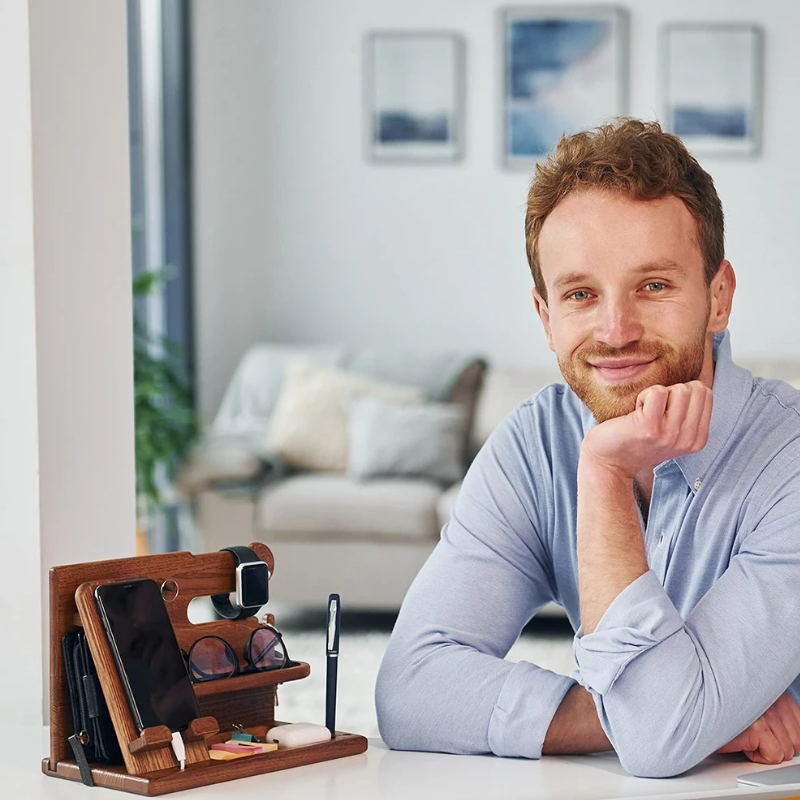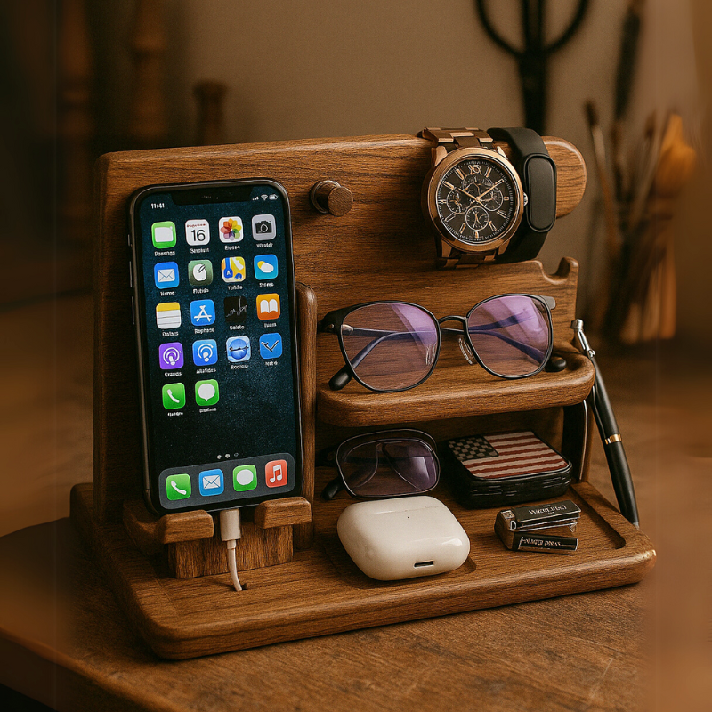 Feito em madeira de alta qualidade, o porta-treco multifuncional exala um charme natural e sofisticado que complementa qualquer ambiente. Seu acabamento impecável e design contemporâneo refletem um gosto apurado, tornando-o uma peça central em sua mesa de trabalho.