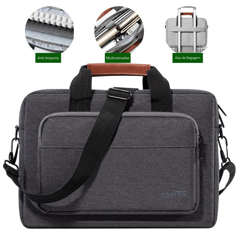 Seu design unissex é perfeito para todos, com a versatilidade de ser carregada na mão ou no ombro, graças à alça ajustável e removível. A base sólida e resistente a batidas, juntamente com o material à prova d'água, garante que seu notebook e outros itens estejam sempre protegidos. O interior multicamadas oferece grande capacidade e organização interna, enquanto a alça de bagagem na parte de trás facilita o transporte durante viagens.