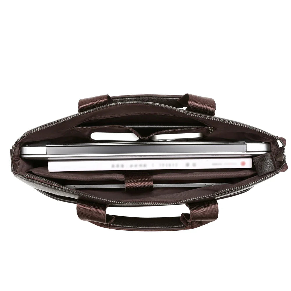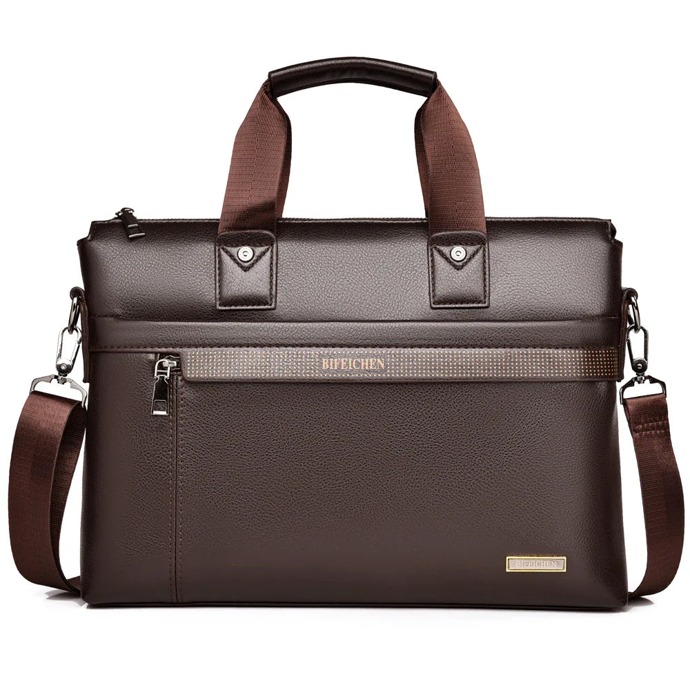 Feita em couro ecológico texturizado de alta qualidade, possui alça ajustável para uso transversal e duas alças firmes para transporte na mão. Seu interior espaçoso conta com divisórias inteligentes que acomodam laptop de até 14”, cadernos, documentos e acessórios, mantendo tudo organizado e seguro com zíper reforçado.