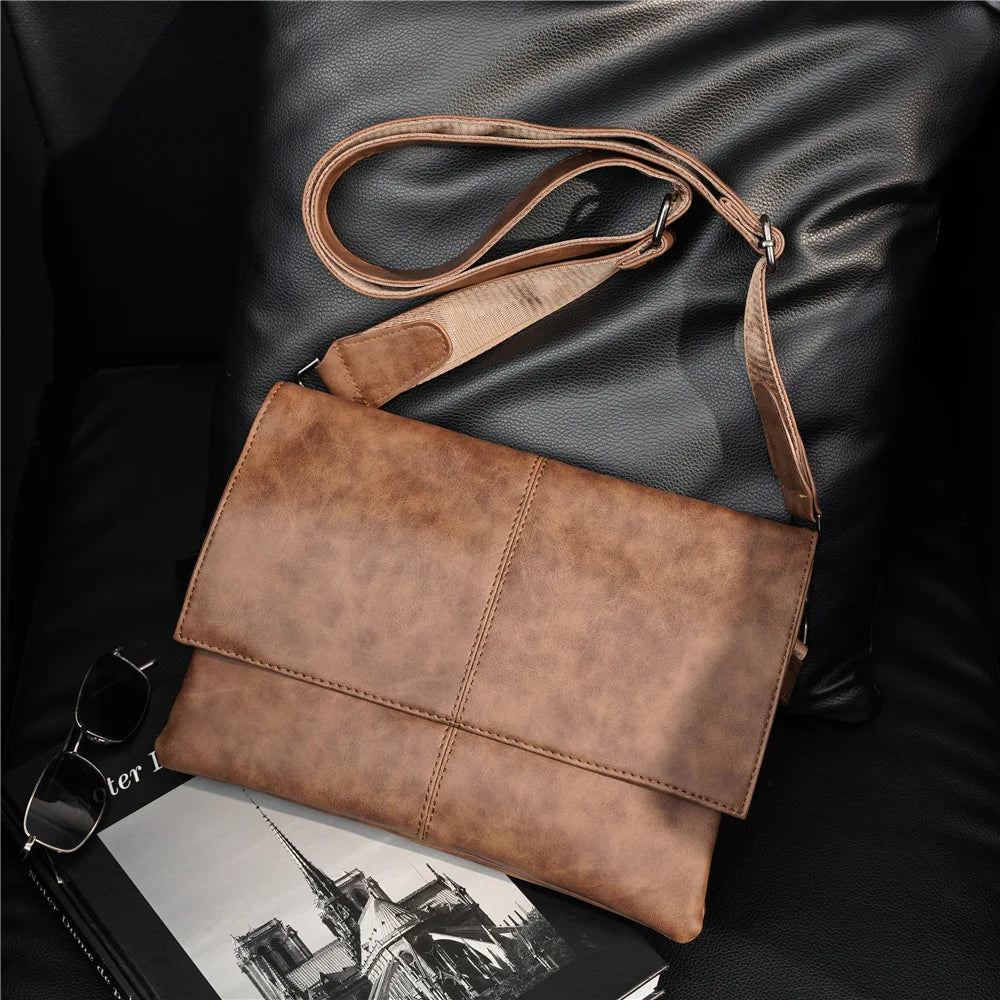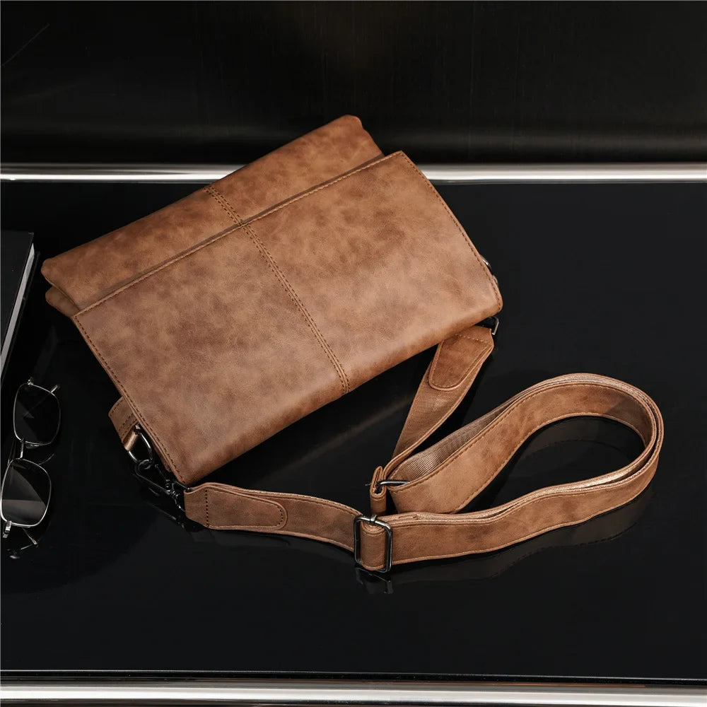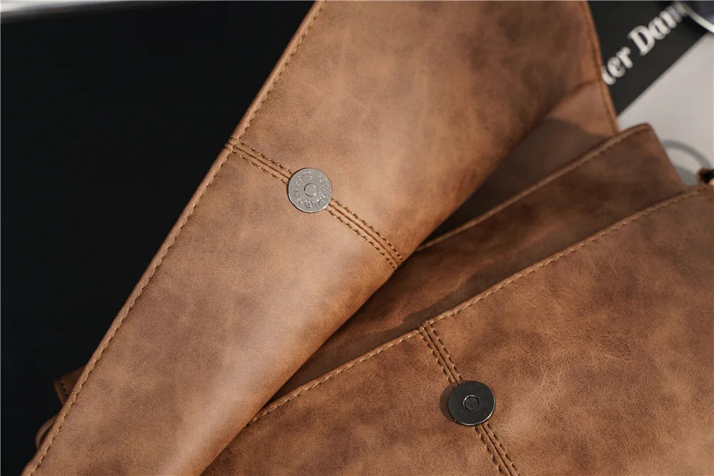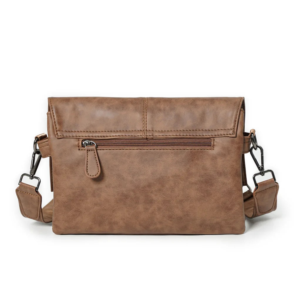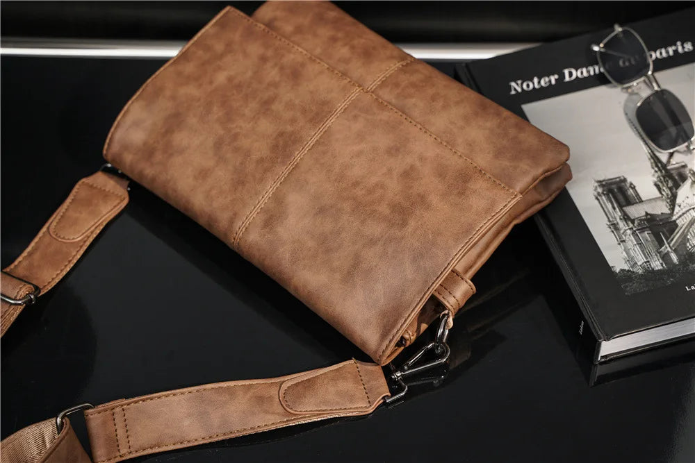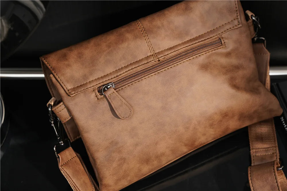 Produzida em couro sintético texturizado que simula o toque do couro envelhecido, ela acompanha tanto um look casual quanto um ambiente mais formal. O fechamento por aba com botão magnético garante praticidade e segurança, enquanto os compartimentos internos e o bolso traseiro com zíper mantêm tudo organizado: celular, carteira, óculos, tablet, livro, chave, câmera. Tudo no lugar.