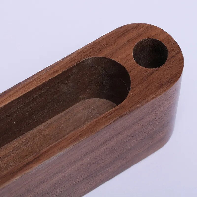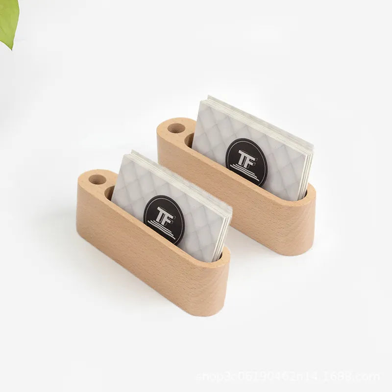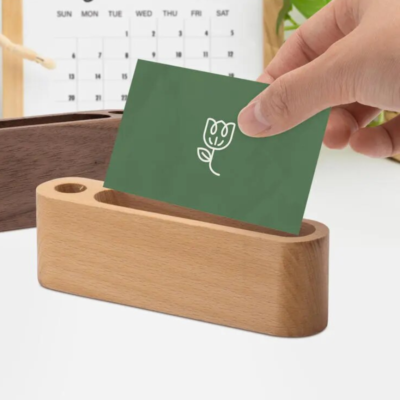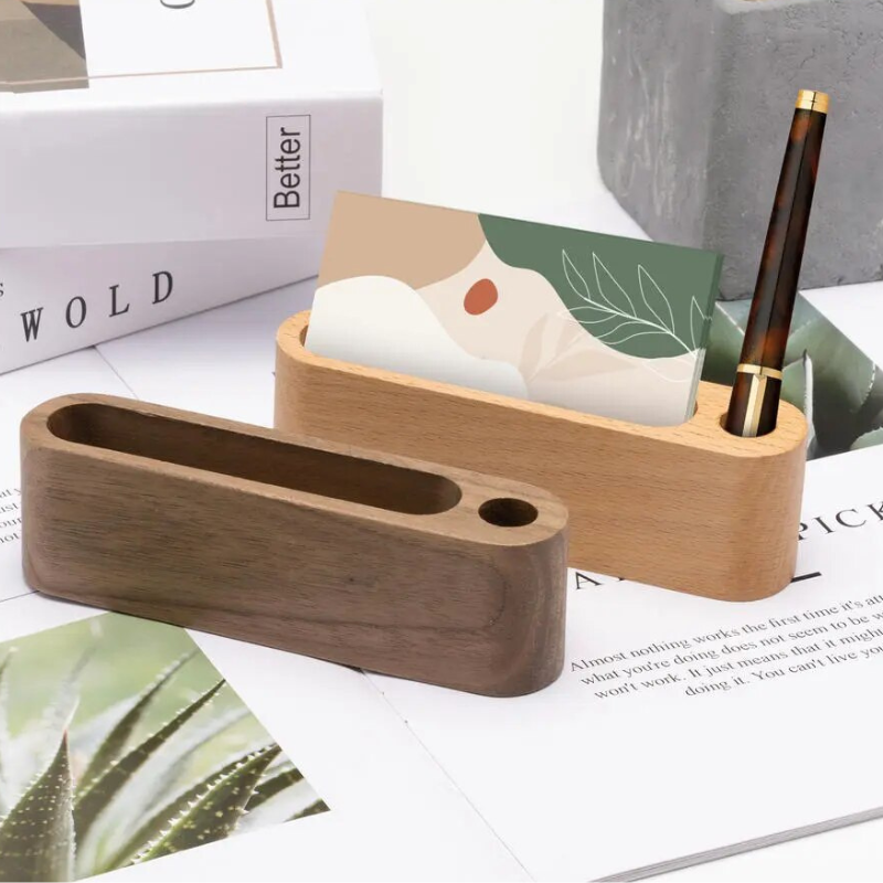 Descubra a harmonia perfeita entre elegância e funcionalidade com nosso porta cartões de visita em madeira nobre, projetado para acomodar de 30 a 50 cartões e equipado com um suporte para caneta.