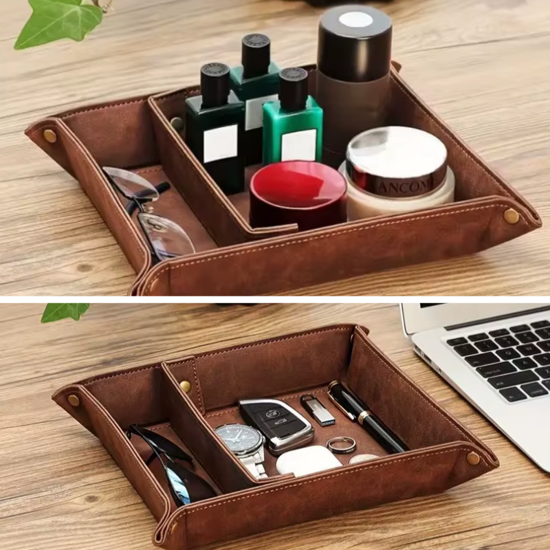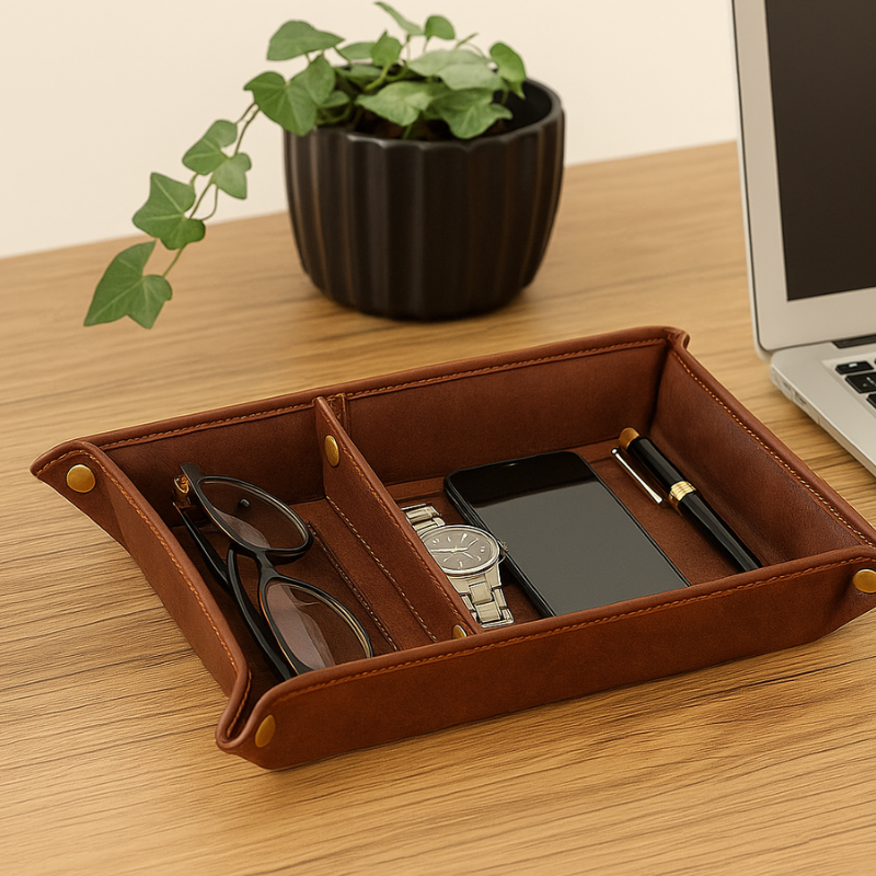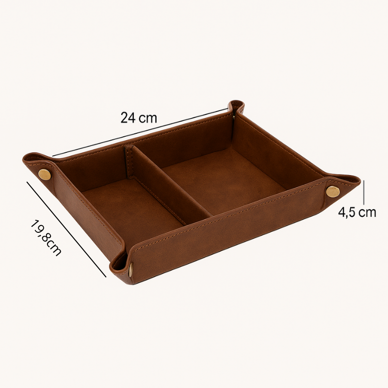 Com acabamento em couro sintético premium e divisórias funcionais, este organizador é perfeito para manter seus itens essenciais sempre à mão — seja no home office, no mesa de cabeceira ou na entrada da casa.